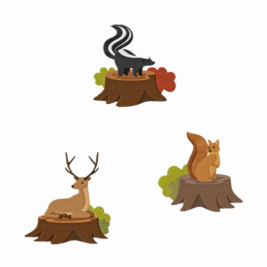 Pack of 15 machine embroidery designs: Forest animals on a tree trunk